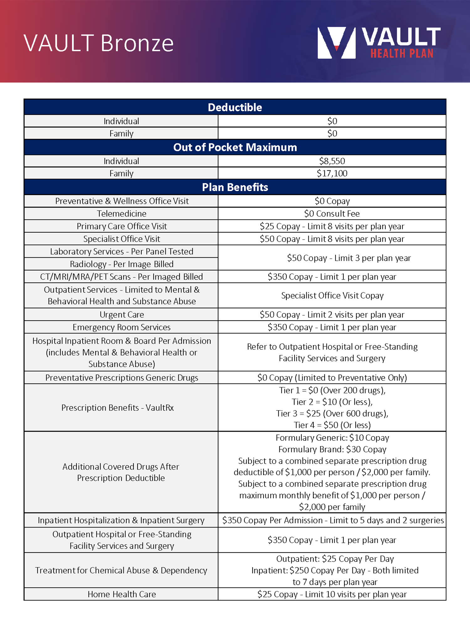 • Labs/Imaging, Hospitalization and Surgery, Preferred Formulary Prescription Coverage, Unlimited $0 Telehealth Consults